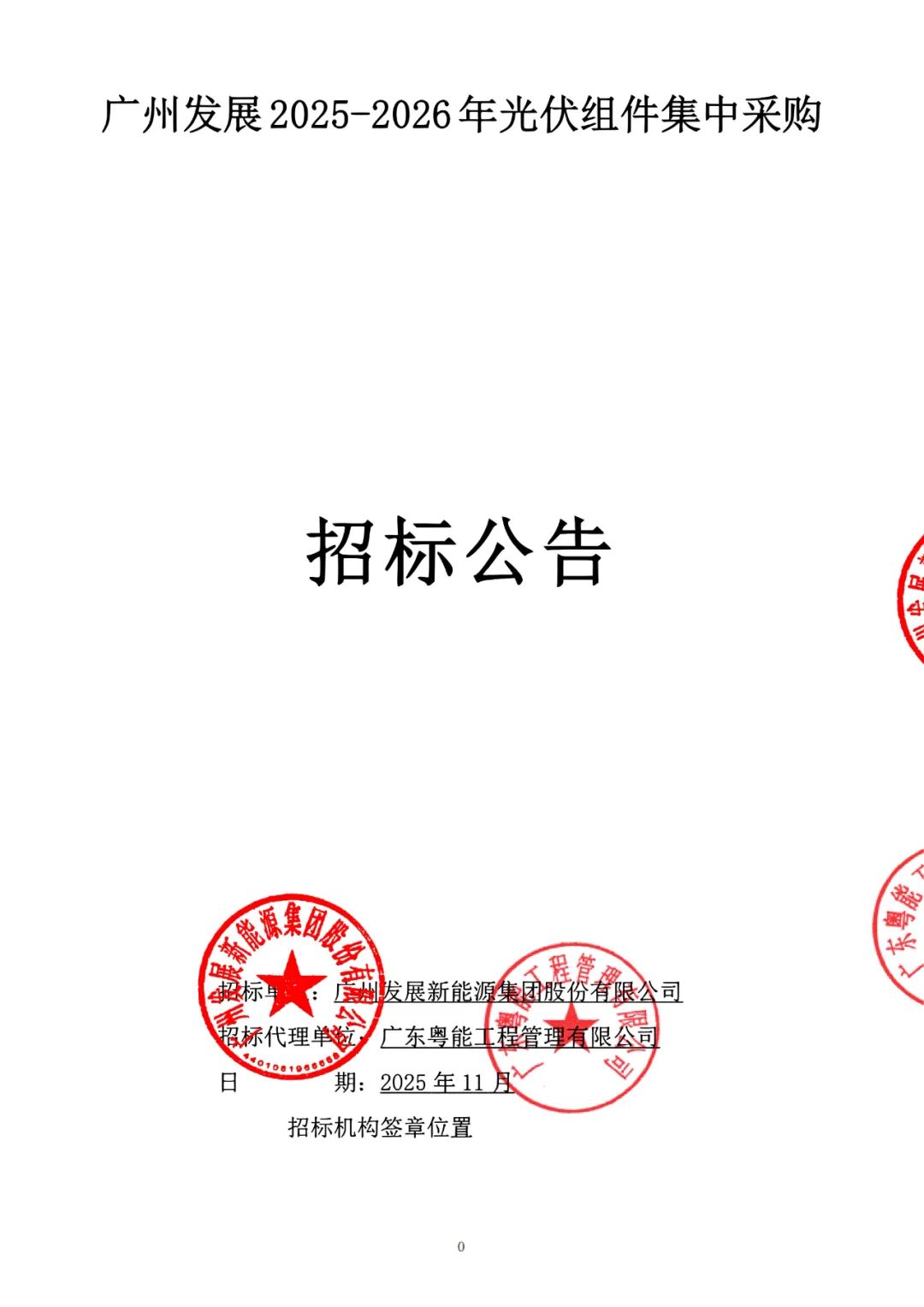 光能圈获悉,11月12日,广州发展2025-2026年光伏组件集中采购招标公告发布。
