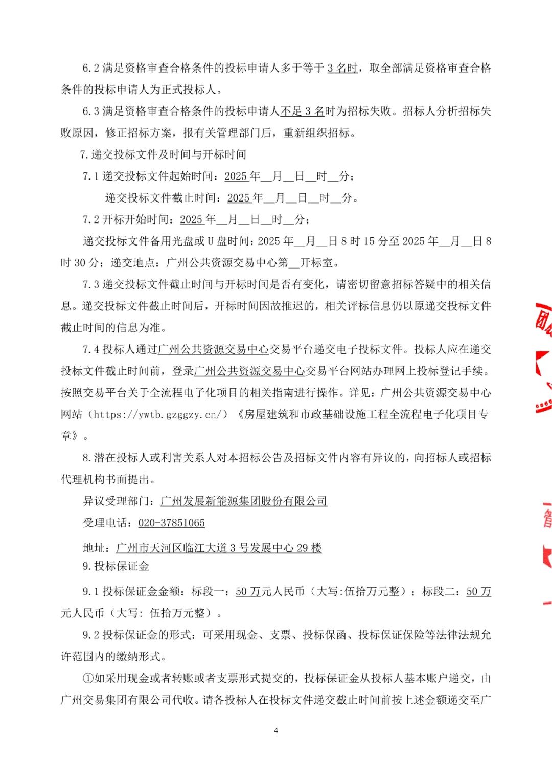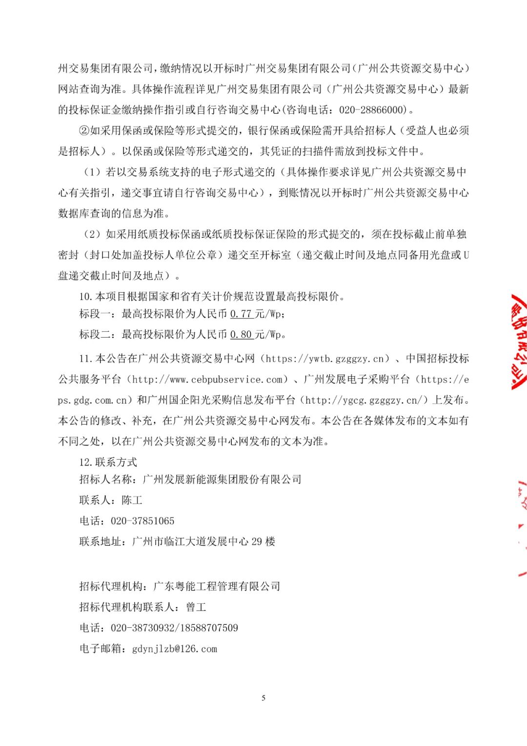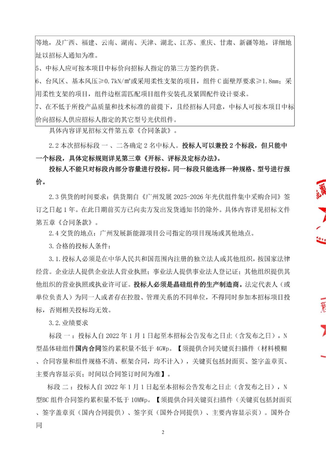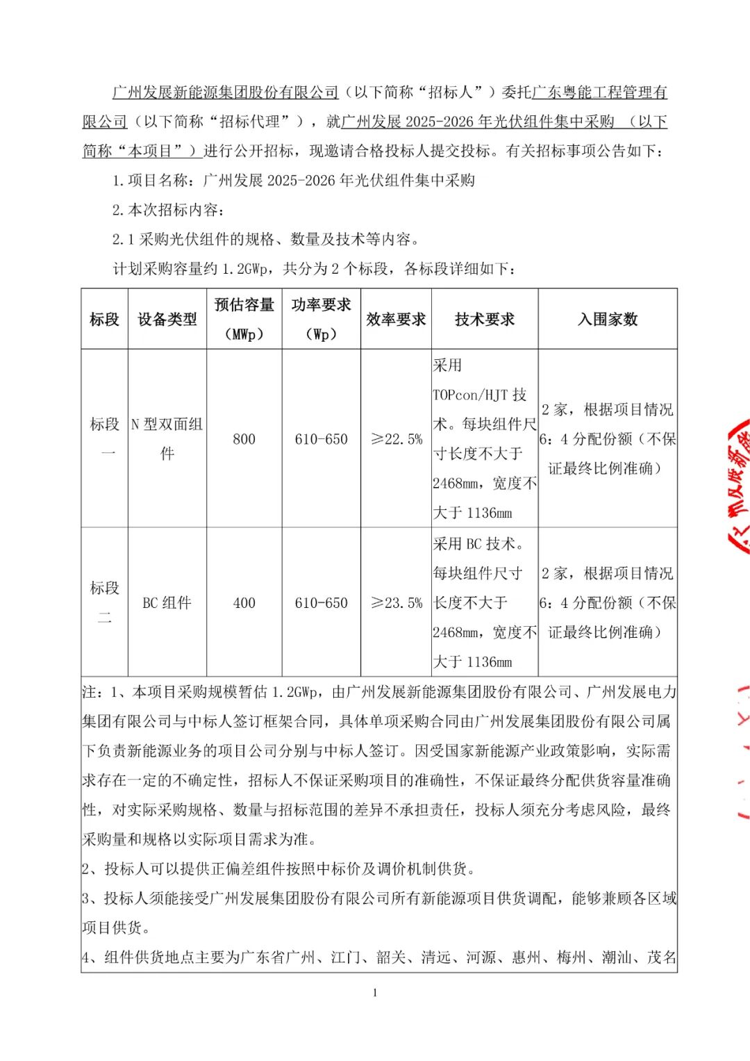 注:1、本项目采购规模暂估1.2GWp,由广州发展新能源集团股份有限公司、广州发展电力集团有限公司与中标人签订框架合同,具体单项采购合同由广州发展集团股份有限公司属下负责新能源业务的项目公司分别与中标人签订。因受国家新能源产业政策影响,实际需求存在一定的不确定性,招标人不保证采购项目的准确性,不保证最终分配供货容量准确性,对实际采购规格、数量与招标范围的差异不承担责任,投标人须充分考虑风险,最终采购量和规格以实际项目需求为准。