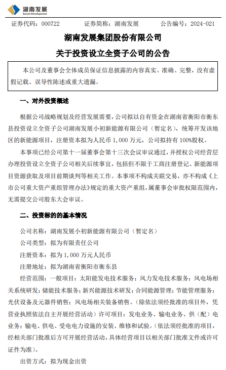 公告称,根据公司战略规划及经营发展需要,公司拟以自有资金在湖南省衡阳市衡东县投资设立全资子公司湖南发展小初新能源有限公司(暂定名),统筹开发该地区的新能源项目,注册资本拟为人民币1,000万元,公司拟持有100%股权。