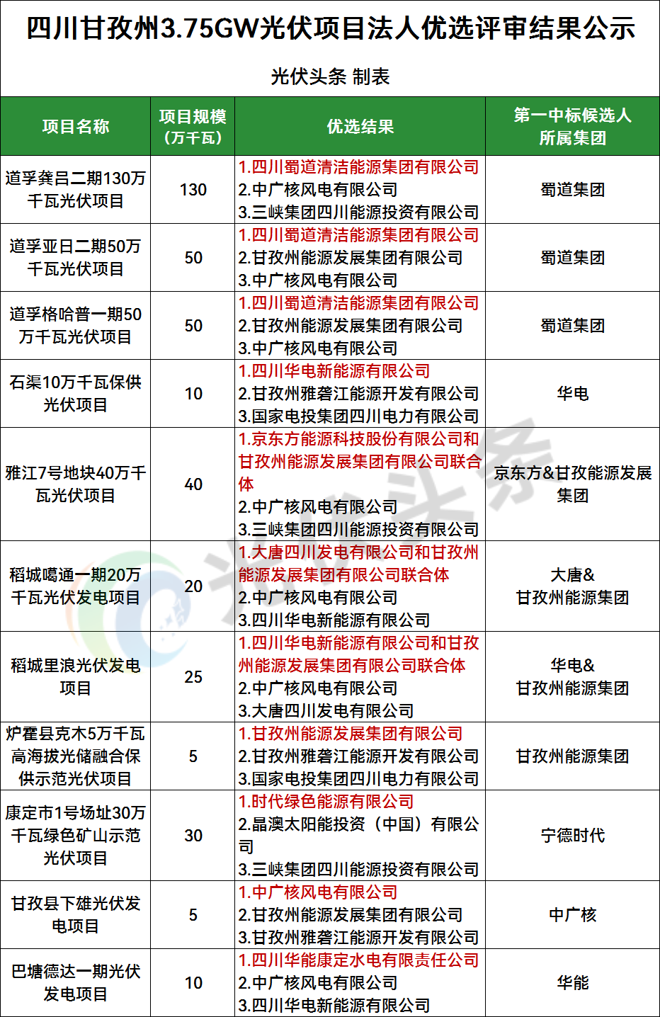 四川甘孜州3.75GW光伏优选:蜀道集团、京东方、甘孜能源发展、宁德时代、华电、大唐、华能、中广核等入围
