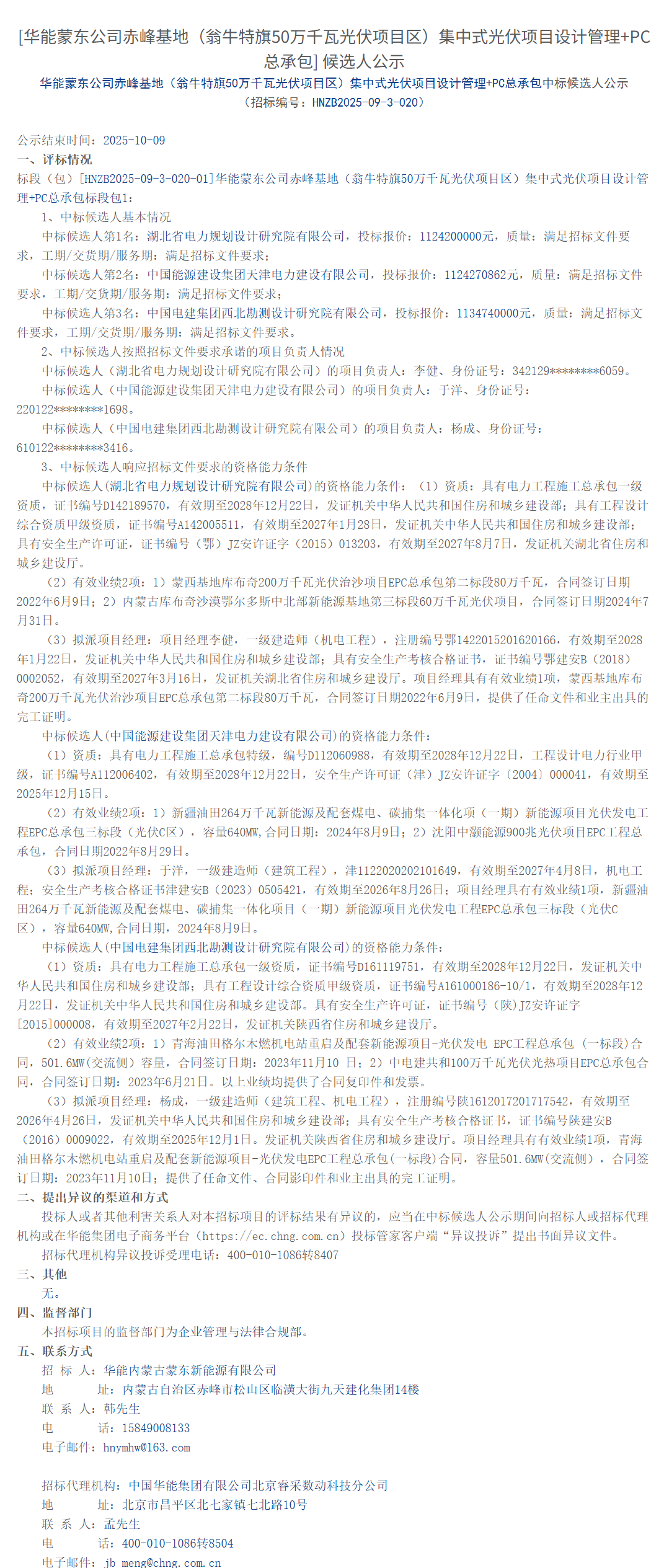 光能圈获悉,日前,华能蒙东公司赤峰基地(翁牛特旗50万千瓦光伏项目区)集中式光伏项目设计管理+PC总承包中标候选人公示。