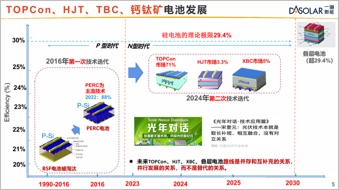 宋登元博士指出,光伏已进入技术多元化共生共荣阶段。据CPIA中国光伏产业发展路线图(2024-2025),2024年N型TOPCon电池市占比达71.1%,标志着晶硅技术完成从P型到N型的代际跃迁。目前,光伏行业技术发展百花齐放,形成了TOPCon、HJT、XBC、钙钛矿及叠层电池等多种技术协同共进的立体化技术矩阵。