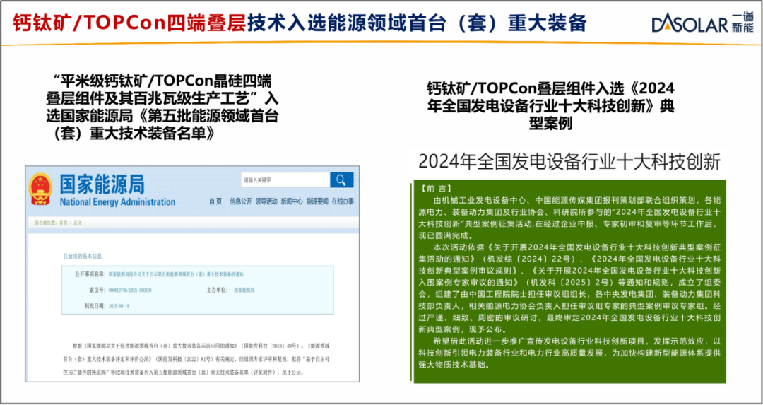 一道新能“一主三翼”技术路线以N型TOPCon技术为核心支柱,构建了覆盖光伏多元技术的创新矩阵。作为主航道的TOPCon技术已迭代至5.0版本,其量产电池平均效率突破27%,开路电压达746mV,成为行业效率标杆。而三翼则延伸至三大前沿领域,DBC 3.0 Plus技术通过隧穿层重构,经国家太阳能光伏产品质量检验检测中心实现27.77%的电池效率。TSiP钙钛矿/TOPCon叠层技术将四端组件效率提升至26.8%,并已成功应用于三峡能源示范项目,“平米级钙钛矿/TOPCon晶硅四端叠层组件及其百兆瓦级生产工艺”入选国家能源局《第五批能源领域首台(套)重大技术装备名单》,钙钛矿/TOPCon叠层组件入选《2024年全国发电设备行业十大科技创新》典型案例。SFOS技术则瞄准40%的极限效率,重新定义光伏技术边界。以TOPCon为平台,通过多技术协同突破单晶硅的物理极限,“一主三翼”技术路线的协同效应不仅体现在效率提升上,更是通过差异化技术组合拓宽了应用端场景,重塑了光伏产业格局。