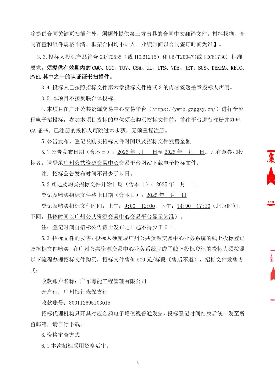 注:1、本项目采购规模暂估1.2GWp,由广州发展新能源集团股份有限公司、广州发展电力集团有限公司与中标人签订框架合同,具体单项采购合同由广州发展集团股份有限公司属下负责新能源业务的项目公司分别与中标人签订。因受国家新能源产业政策影响,实际需求存在一定的不确定性,招标人不保证采购项目的准确性,不保证最终分配供货容量准确性,对实际采购规格、数量与招标范围的差异不承担责任,投标人须充分考虑风险,最终采购量和规格以实际项目需求为准。
