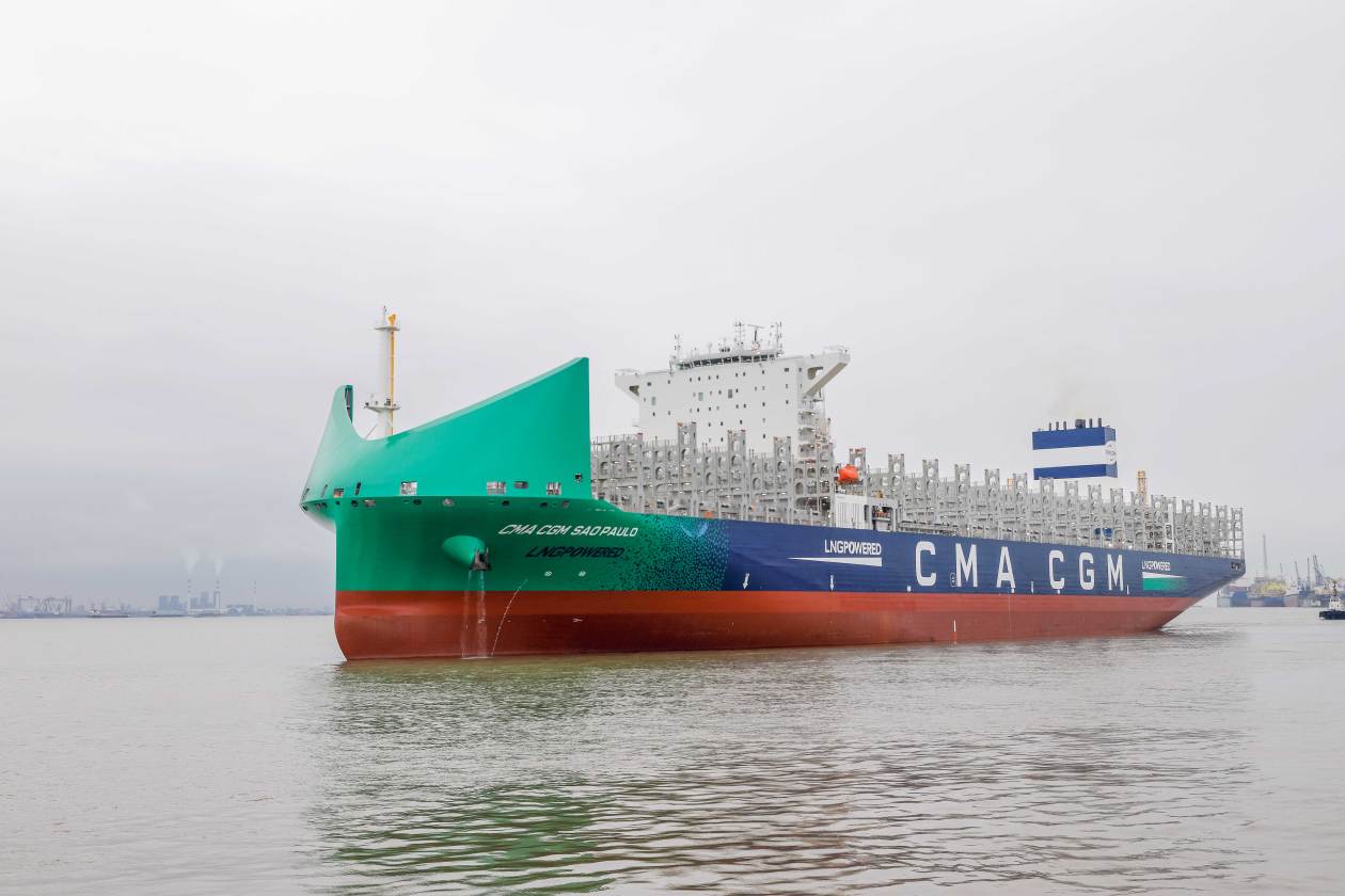 CMA CGM SAOPAULO号由中国船舶集团旗下第七〇八研究所设计,总长336米,型宽51米,型深26.8米,设计服务航速 21节,最大载箱量13200个标准箱。该船采用LNG双燃料动力系统,配备一个14000立方米MarkⅢ型液货围护系统的LNG液货舱,搭载世界先进的中国船舶集团自主品牌CMD-WinGD9X9DF-2.0主机,并配备全球新一代智能控制废气再循环(ICER)系统,可使气体模式下的甲烷逃逸降低50%,温室气体排放减少28%以上。该船在船头特别安装了一个巨大的风流导板,在实际运营过程中可节省2%~4%油耗;在艉部还安装了节能导流装置,可提高螺旋桨推进效率,降低能耗1.5%左右,并能显著减少二氧化碳气体排放。因此,其具有载箱灵活、技术领先、节能环保等特点,被誉为全球最新一代、最新款绿色环保、高效节能型集装箱船。