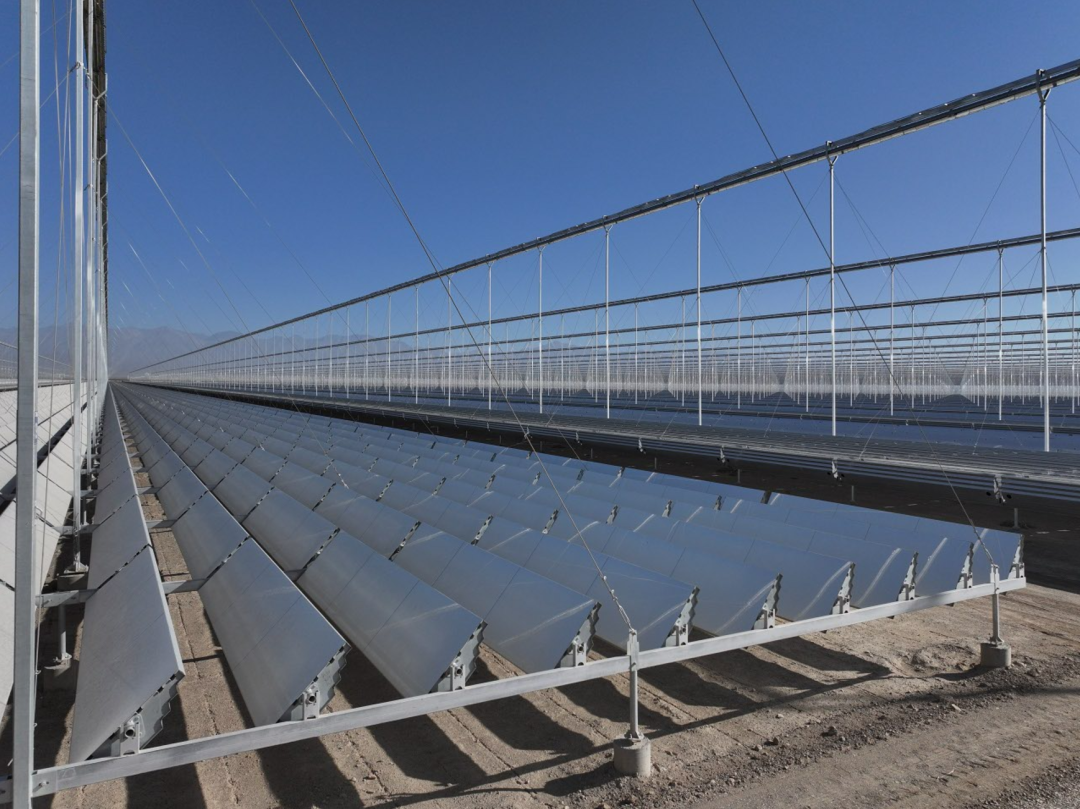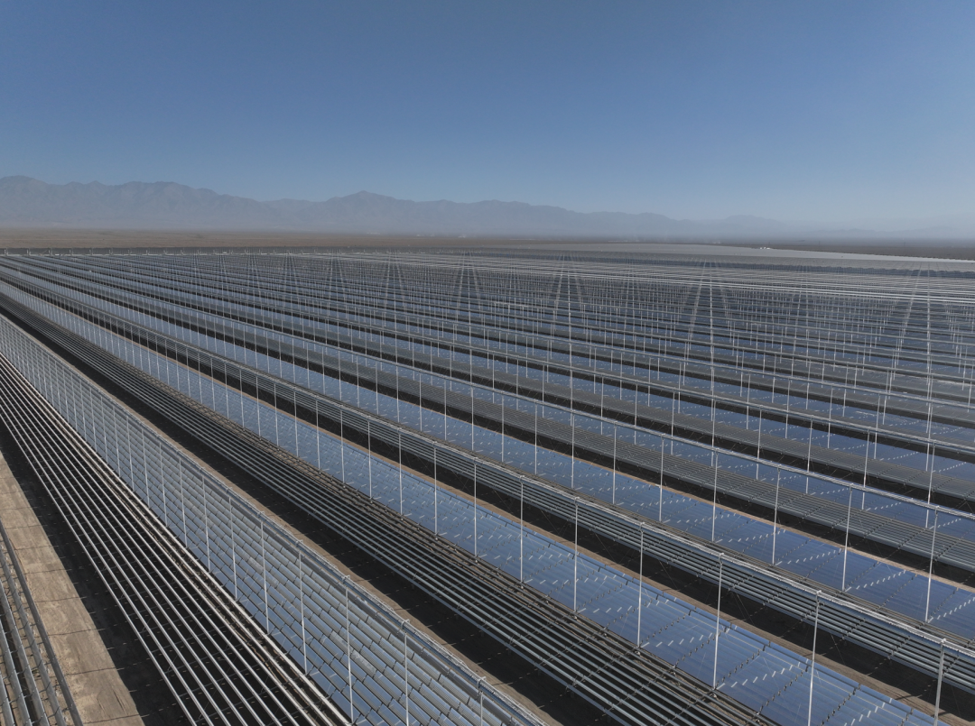 该项目最值得一提的,是其采用的“线性菲涅尔”技术。“线性菲涅尔”技术是太阳能光热发电技术的一种,因其采用了法国物理学家菲涅尔所提出的光的反射和折射原理而得名。该技术使用多排安装在地面上的、平面或微曲的反射镜,通过单轴追踪太阳,将阳光精确地反射到位于高处的固定集热管上,进而再将热能转化为电能。相比起传统的“塔式菲涅尔”,“线性菲涅尔”对场地要求低,其分布式控制也有效提升了发电的可靠性,降低了运维成本。