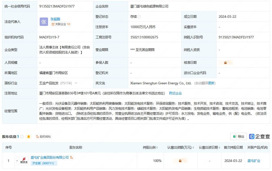 近日光能圈从企查查了解到,3月22日,厦门盛屯绿色能源有限公司成立,法定代表人为张振鹏,注册资本1亿人民币,经营范围含光伏设备及元器件销售、太阳能发电技术服务、环保咨询服务、风力发电技术服务、储能技术服务、电池销售等。该公司由盛屯矿业全资持股。