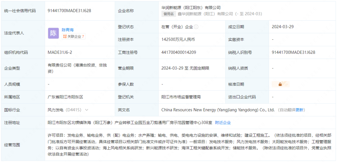 3月29日,据光能圈了解到,华润新能源(阳江阳东)有限公司成立,法定代表人为陈青海,注册资本14.25亿元,经营范围含发电技术服务、风力发电技术服务、太阳能发电技术服务、工程管理服务、以自有资金从事投资活动、海上风电相关系统研发、新兴能源技术研发、海洋工程关键配套系统开发、储能技术服务等。