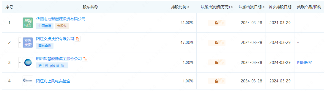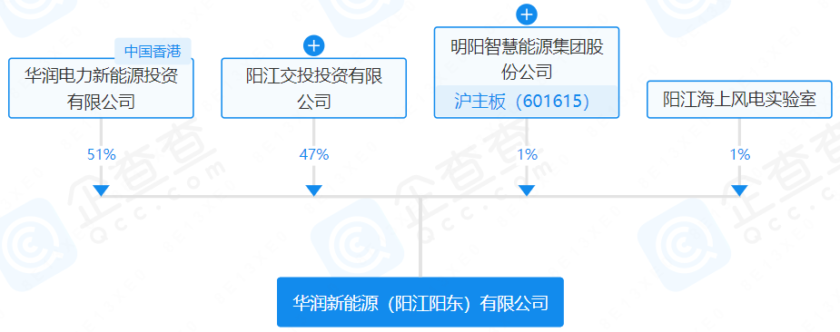 股权穿透图显示,华润新能源(阳江阳东)有限公司由华润电力新能源投资有限公司、阳江交投投资有限公司、明阳智能、阳江海上风电实验室共同持股。