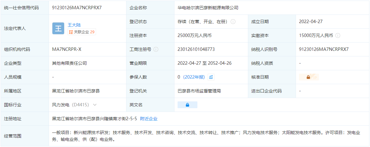 光能圈从企查查了解到,4月28日,华电(哈尔滨)新能源有限公司成立,法定代表人为郑勇斗,注册资本1000万人民币,经营范围含新兴能源技术研发、风力发电技术服务、太阳能发电技术服务、储能技术服务等。该公司由华电能源(600726)全资持股。